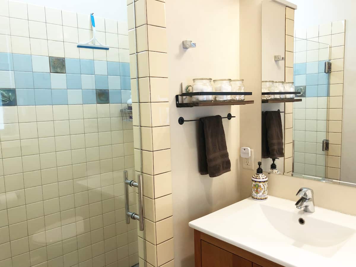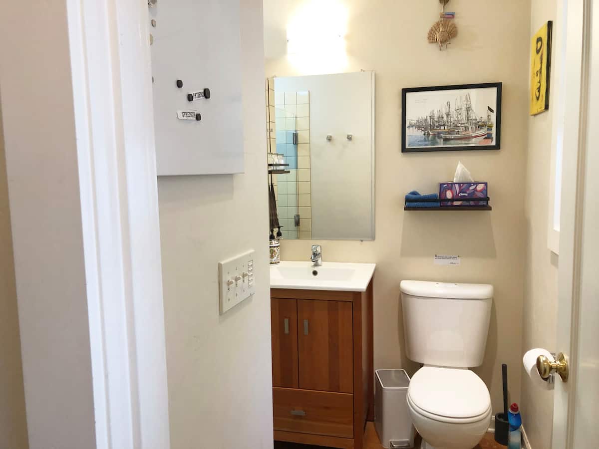Comfortable, well lit space with skylights and large windows. Enjoy a full bathroom with roomy shower. Floor heating keeps your feet warm in the winter. Private doors to the street as well as your own deck and access to the garden. Plenty of space for 2 guests. - Nothing fancy, modest & practical.